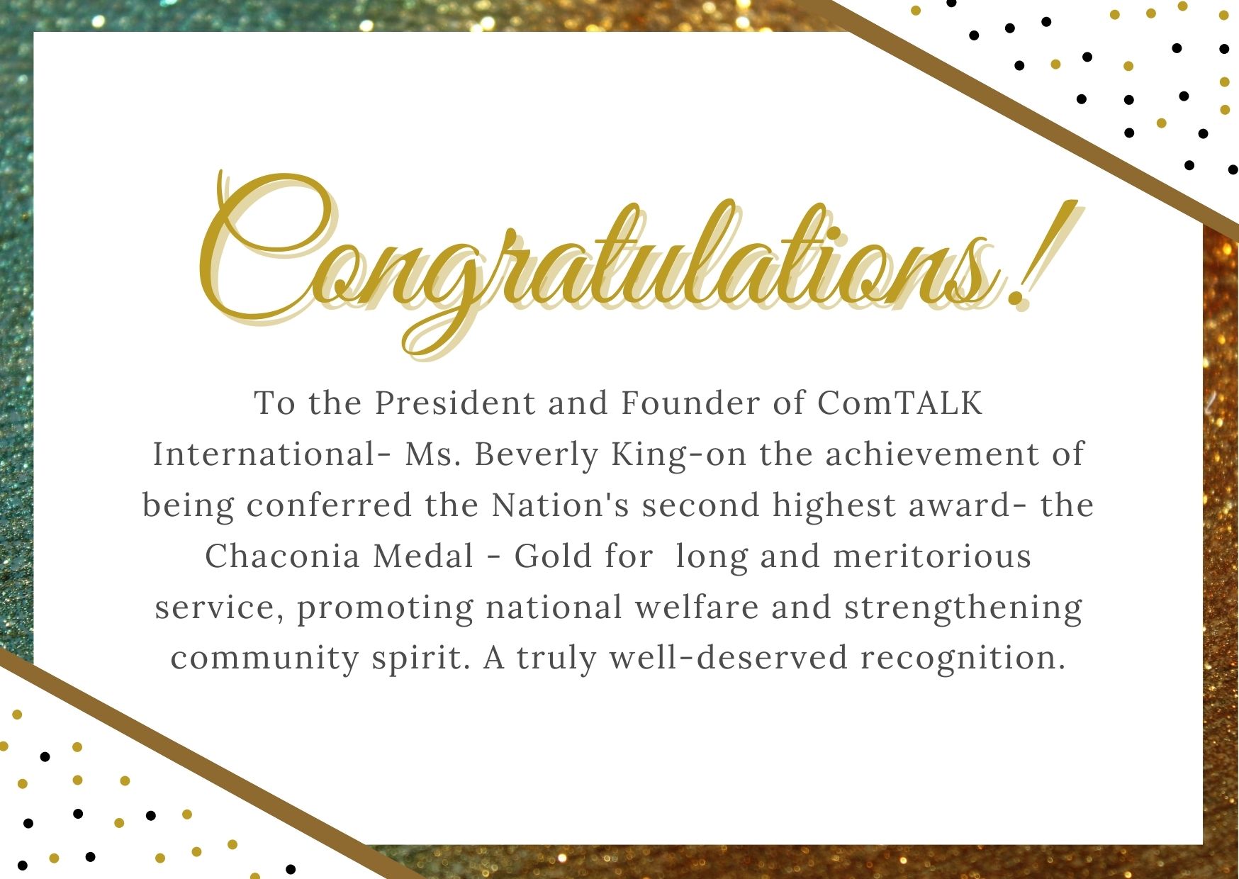 ComTALK International and its allies congratulate Ms. Beverly King on her achievement of being conferred with the second highest National Award, the Chaconia Medal Gold. Ms King was conferred with this award on March 9, 2022 by Her Excellency, the President Paula Mae Weekes, ORTT. Ms. King has toiled sacrificially for 30 years providing psychosocial support for persons infected and affected with HIV. She has nursed persons with HIV, conducted workshops to educate persons about how to prevent STIs and manage their sexuality, trained peer counsellors, conducted Support Groups at South AIDS SUPPORT and ComTALK International, as well as work closely with medical staff and international organizations in the field Many times she has gone beyond expectations by assisting PLHIVs with their financial, housing and medical needs and material resources, and provided an empathetic ear to their challenges. Ms King has also contributed to research in HIV in Trinidad and in the wider Caribbean region and is one of the key persons implementing the Strengthening Psychosocial and Community Resilience Programme in rural communities in East Trinidad. This is a well-deserved award and we proudly stand behind her as the accolades keep pouring in from local, regional and international circles and from persons and their relatives whose lives she has touched