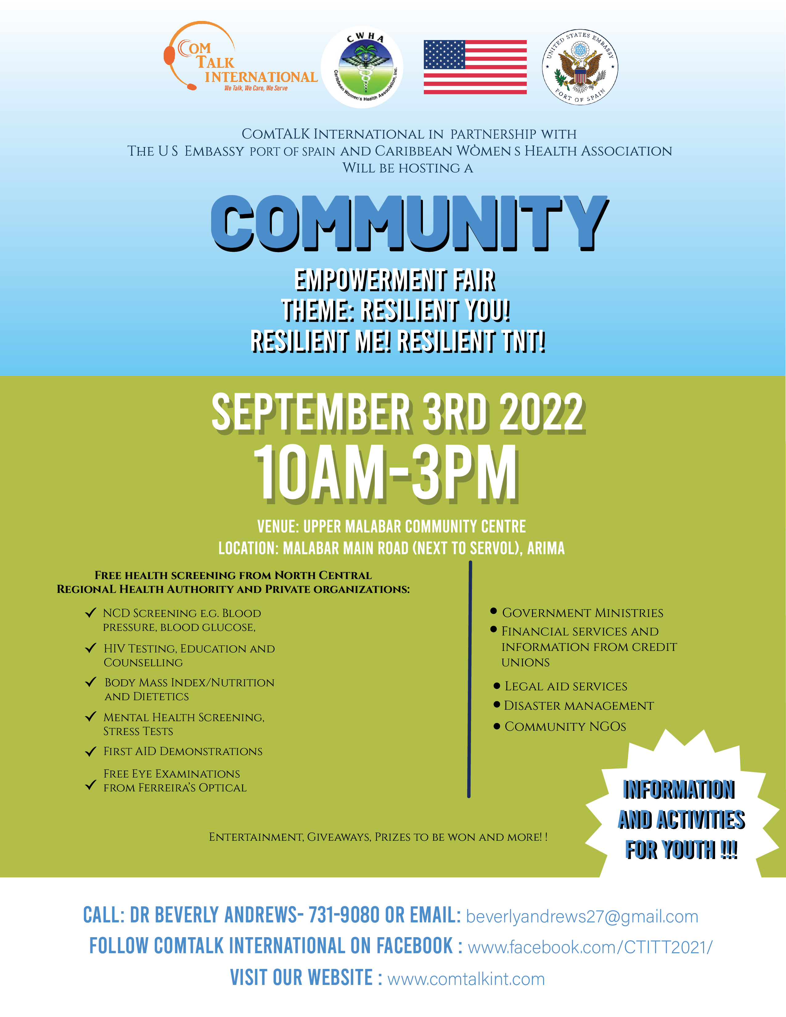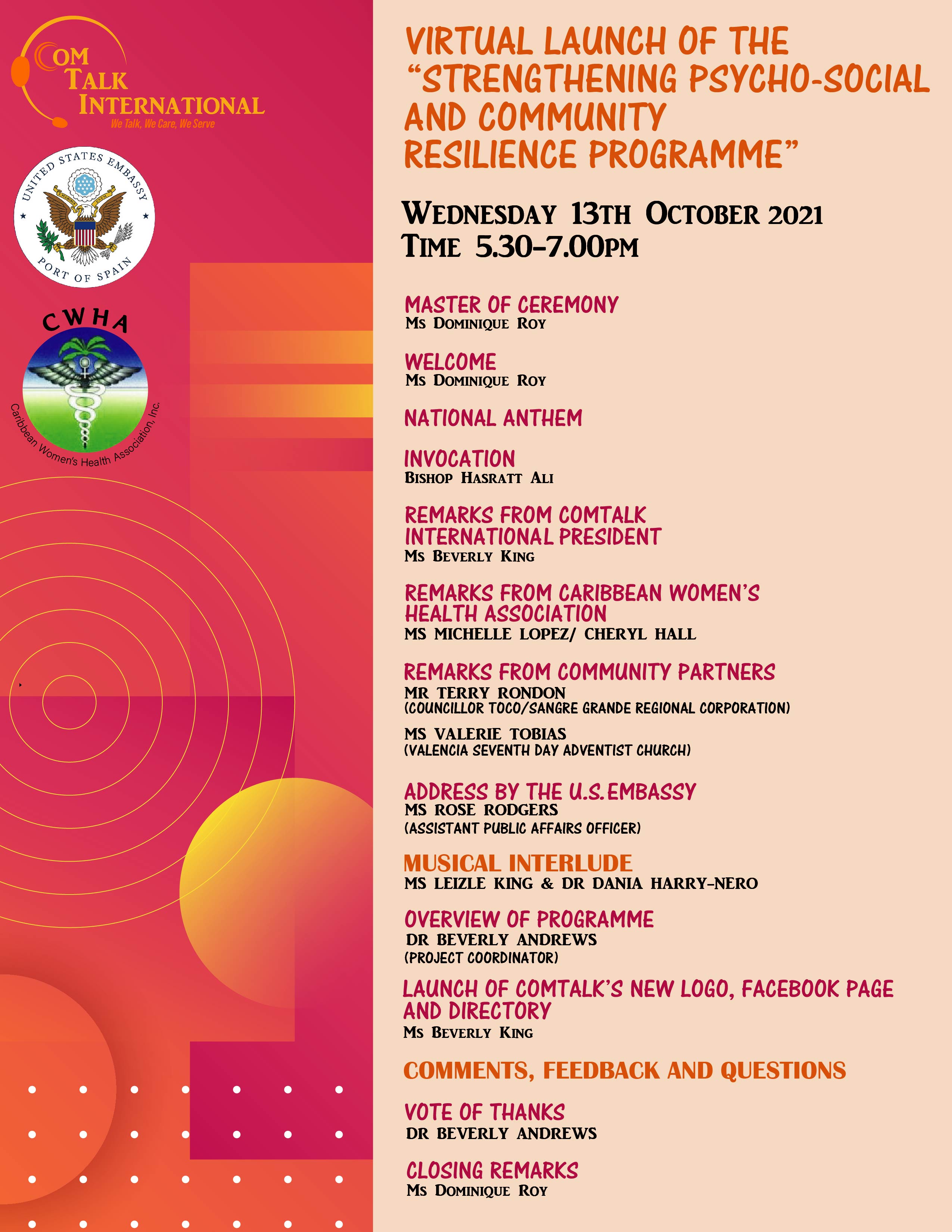 On Wednesday 13th October 2021, ComTALK International in collaboration with The Department of State, U.S. Embassy Port of Spain and Caribbean Women's Health Association virtually launched the Programme "Strengthening Psycho-Social and Community Resilience in Rural Areas in East Trinidad ” which aims to increase capacity for sustained livelihoods, empower and enable more resilient individuals and communities, and facilitate sustainable links and networks with our U.S. Collaborating Partner and local organizations. This programme includes several activities including Capacity Building Workshops destined to train, reach, and empower persons in the rural communities of Arima, Toco/Sangre Grande, and Valencia and environs, provision of psycho-social support, development of community resources, etc. We thank all our Partners, Community Leaders, Community Groups, government and non-government Ministries and agencies, faith-based organizations, regional corporations, representatives of MP offices, residents of the communities and all persons for attending the launch event. We thank especially the U.S. Embassy and the Caribbean Women’s Health Association for partnering with us in the programme. We look forward to all of your continued support and the great work that lies ahead.