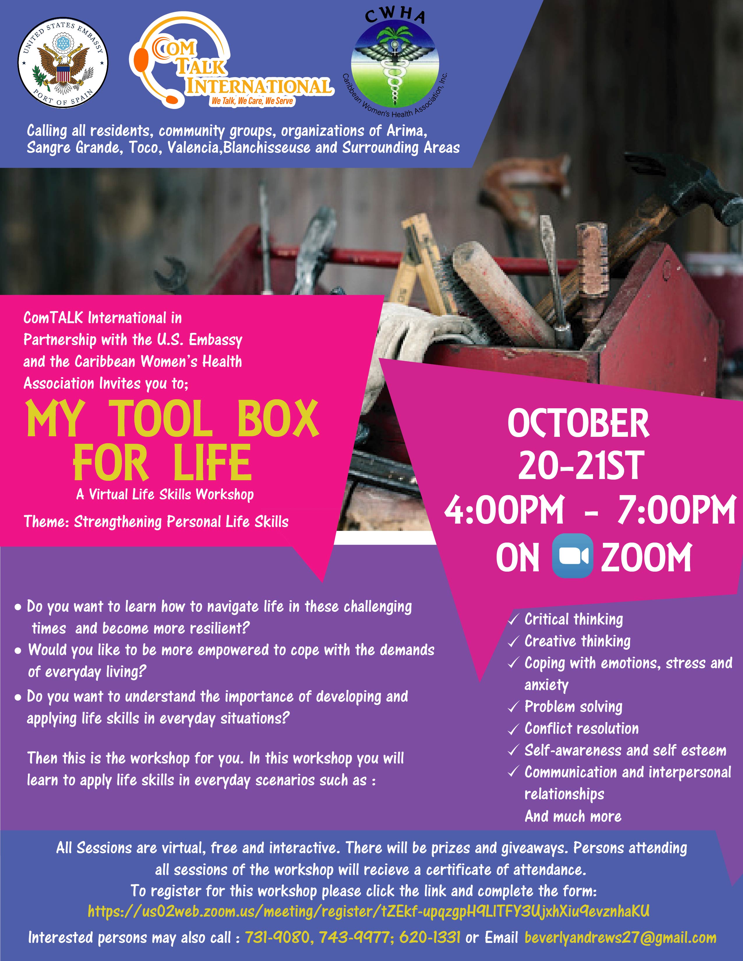 On October 20th - 21st, ComTALK International in collaboration with the U.S. Embassy and the Caribbean Women's Health Association hosted, "My Tool Box For Life: A Virtual Life Skills Workshop". Designed especially for the residents, community groups & organizations of Arima, Valencia, Sangre Grande, Toco, Blanchisseuse and environs. This workshop forms part of several activities being implemented as components of the programme ‘Strengthening Psycho-Social and Community Resilience in Rural Areas in East Trinidad’. In welcoming the participants, the Project Coordinator, Dr Beverly Andrews highlighted the objectives of the programme which are to: 1. Reduce knowledge gaps in public health emergencies and challenges such as COVID 19, HIV and AIDS, Gender-based violence and disaster preparedness, legal literacy 2. Increase individual and community resilience through capacity building 3. Strengthen community social networks and social capital by creating an online platform for promoting disaster preparedness, COVID 19 and HIV and AIDS information and providing psychosocial support through expert counselling, discussion forums, peer support 4. Increase self and community sustainability by building and supporting entrepreneurial skills development and sustainable livelihoods of rural and vulnerable communities. With powerful and interactive presentations from professionals in their respective fields, attendees on Day 1 were exposed to interpersonal and communicative life skills, conflict resolution, negotiation skills and their level of assertiveness. Day 2 challenged participants to explore self-management skills such as coping with emotions and emotional intelligence, their awareness of self, how to cope with stress and anxiety and how to enhance their thinking skills critically and creatively. We also looked at ways to improve problem solving and decision-making skills. The workshop saw an online attendance of over 60 persons daily and featured interactive sessions with polls, quizzes and prizes. There was representation from several community groups, faith-based organisations, ministries and other organisations. We congratulate our prize winners on Day 1 and Day 2. We look forward to the positive impact of these enriching sessions in their individual lives, families, community groups and organizations. We also wish to express gratitude to all our dedicated facilitators who shared at each of the sessions and Ms Beverly King, ComTALK Founder. Our next life changing workshop will focus on Strengthening Personal and Community Resilience and is carded for November 17-18th 2021.